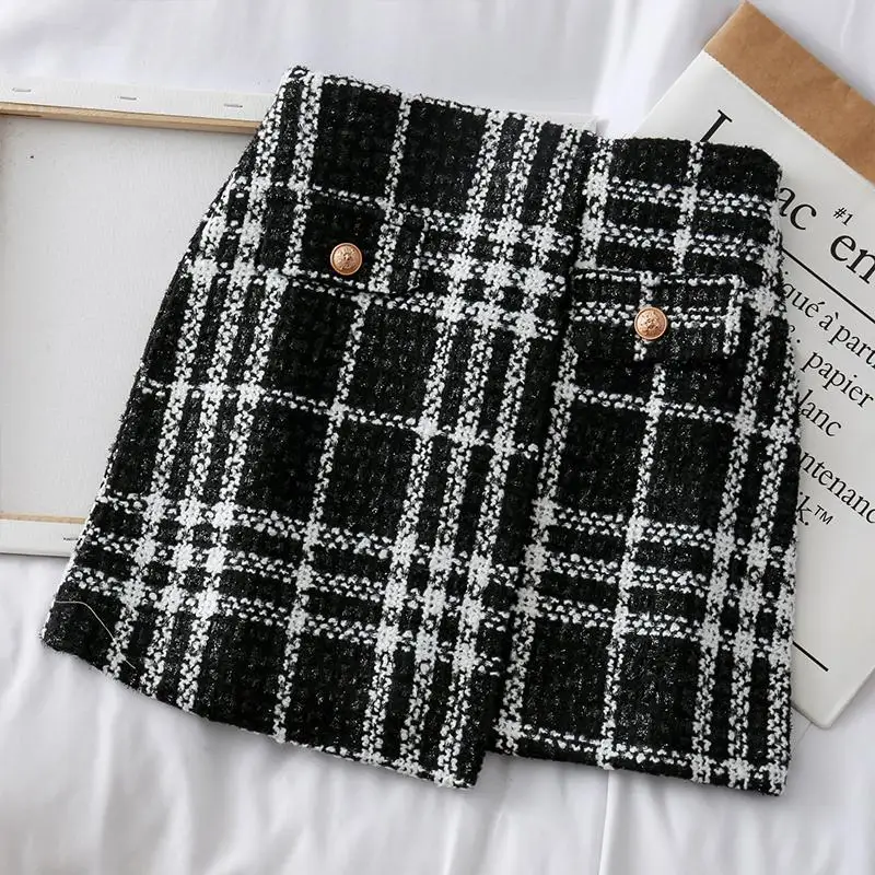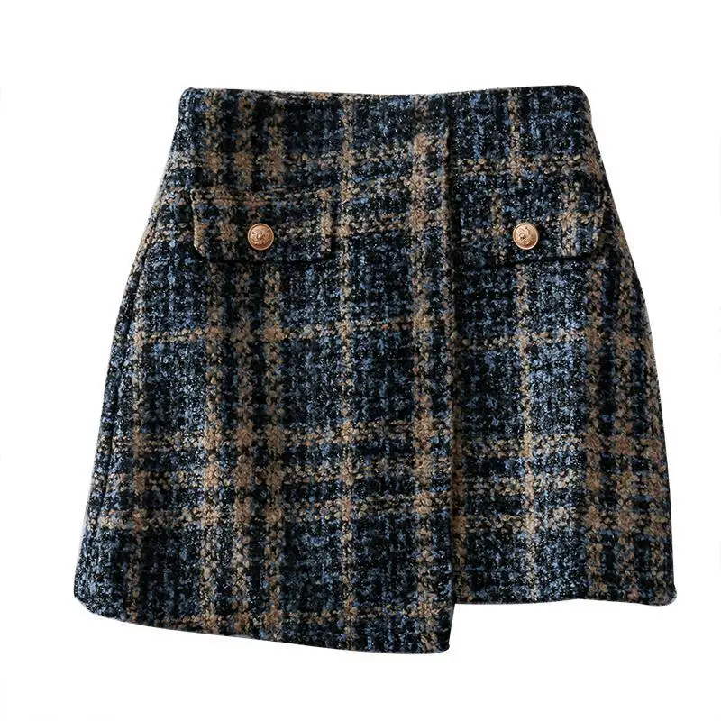 Promo Spring Sexy Skirt Irregular hem Retro Tweed High Waist Hip Color Matching Plaid Skirt A-line Two Button Pockets Skirts Womens