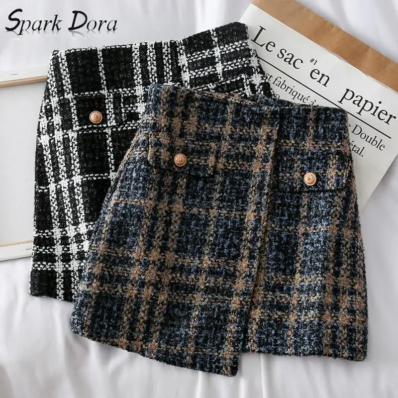 Best Offer Spring Sexy Skirt Irregular hem Retro Tweed High Waist Hip Color Matching Plaid Skirt A-line Two Button Pockets Skirts Womens