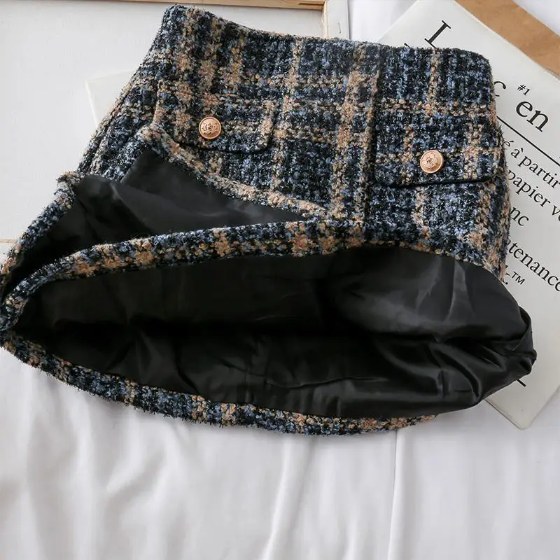 Get this Spring Sexy Skirt Irregular hem Retro Tweed High Waist Hip Color Matching Plaid Skirt A-line Two Button Pockets Skirts Womens with limited time discount by pressing the button below