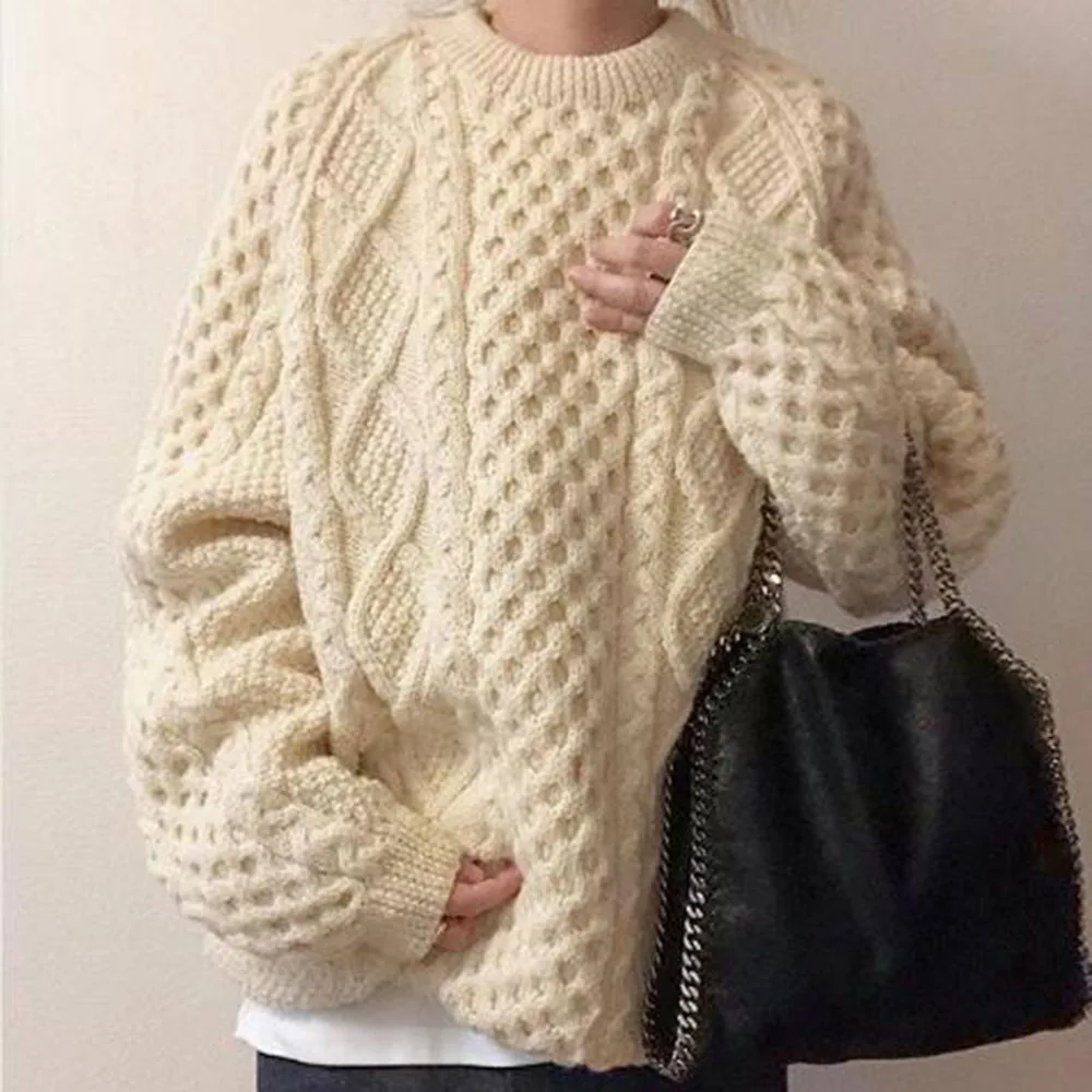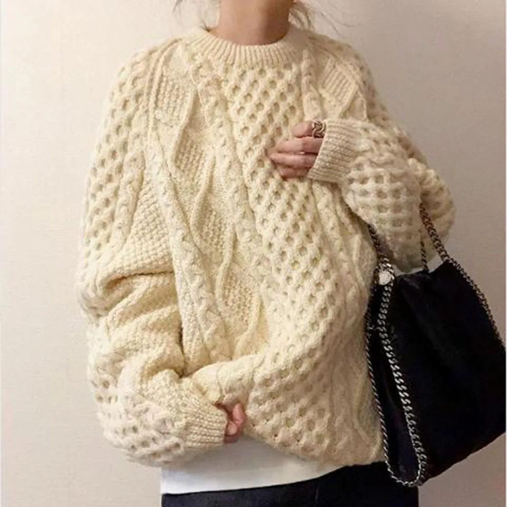 New Plian Knitted Sweater Women Korean Basic Warm Solid Pullovers Sweet Retro Ribbed Jumpers Oversized Knit Wear Minimalist Beige